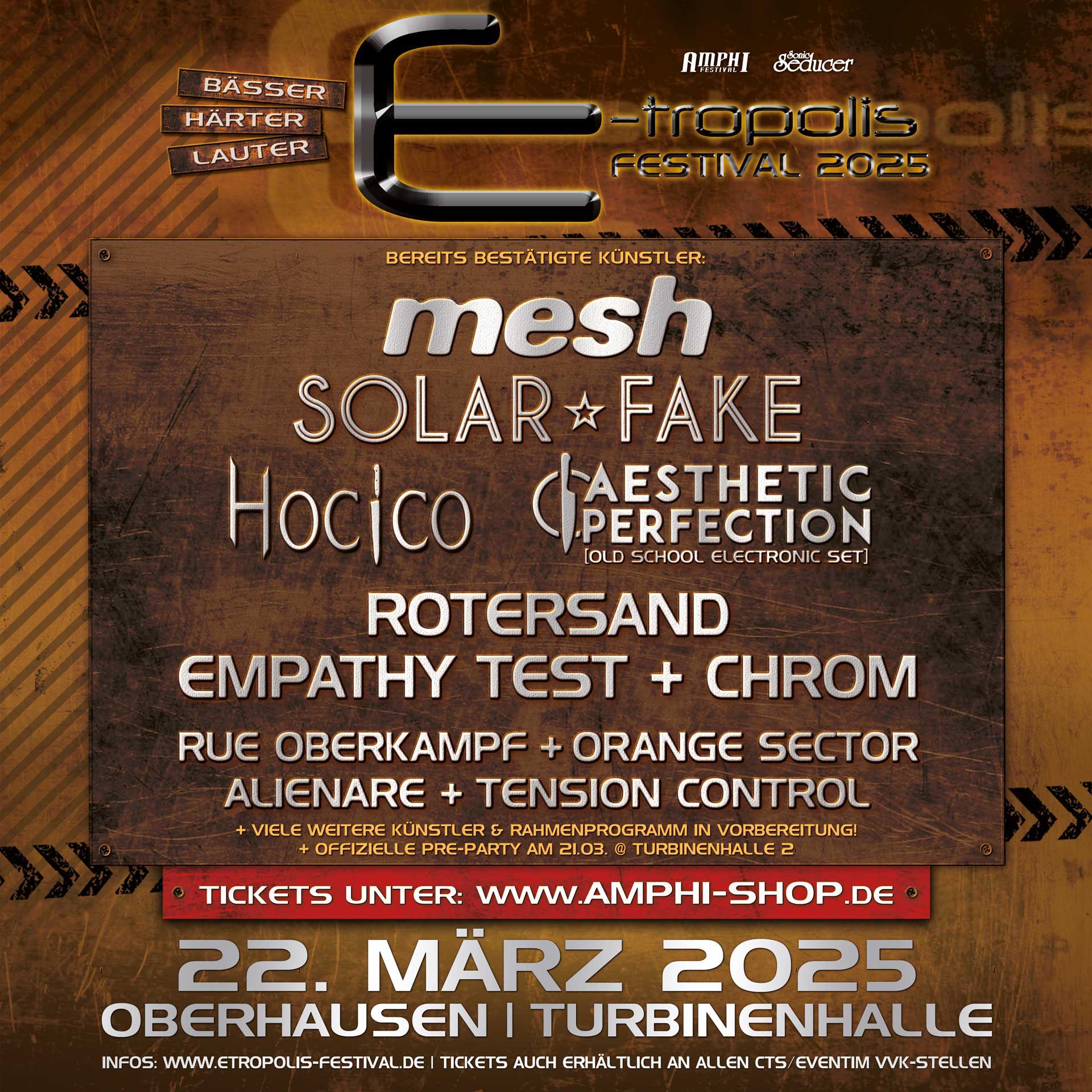 Das E-tropolis Festival 2025 findet am 22.03.2025 in der Turbinenhalle Oberhausen statt. Originaltickets und 5+1 Bundles gibt es unter www.amphi-shop.de! Des Weiteren sind E-tropolis Festivaltickets an allen bekannten CTS/EVENTIM Vorverkaufsstellen und online bei www.eventim.de (auch als Print@Home) erhältlich!