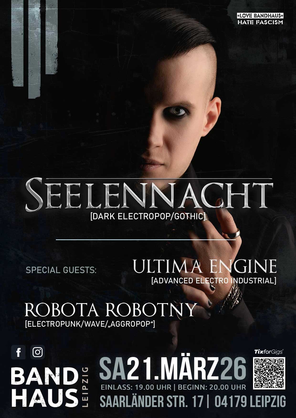 + Special Guests:Ultima Engine (Advanced Electro Industrial)Robota Robotny – das Sideproject von Seelennacht! (Electropunk/“Aggropop“)und Aftershow-Party